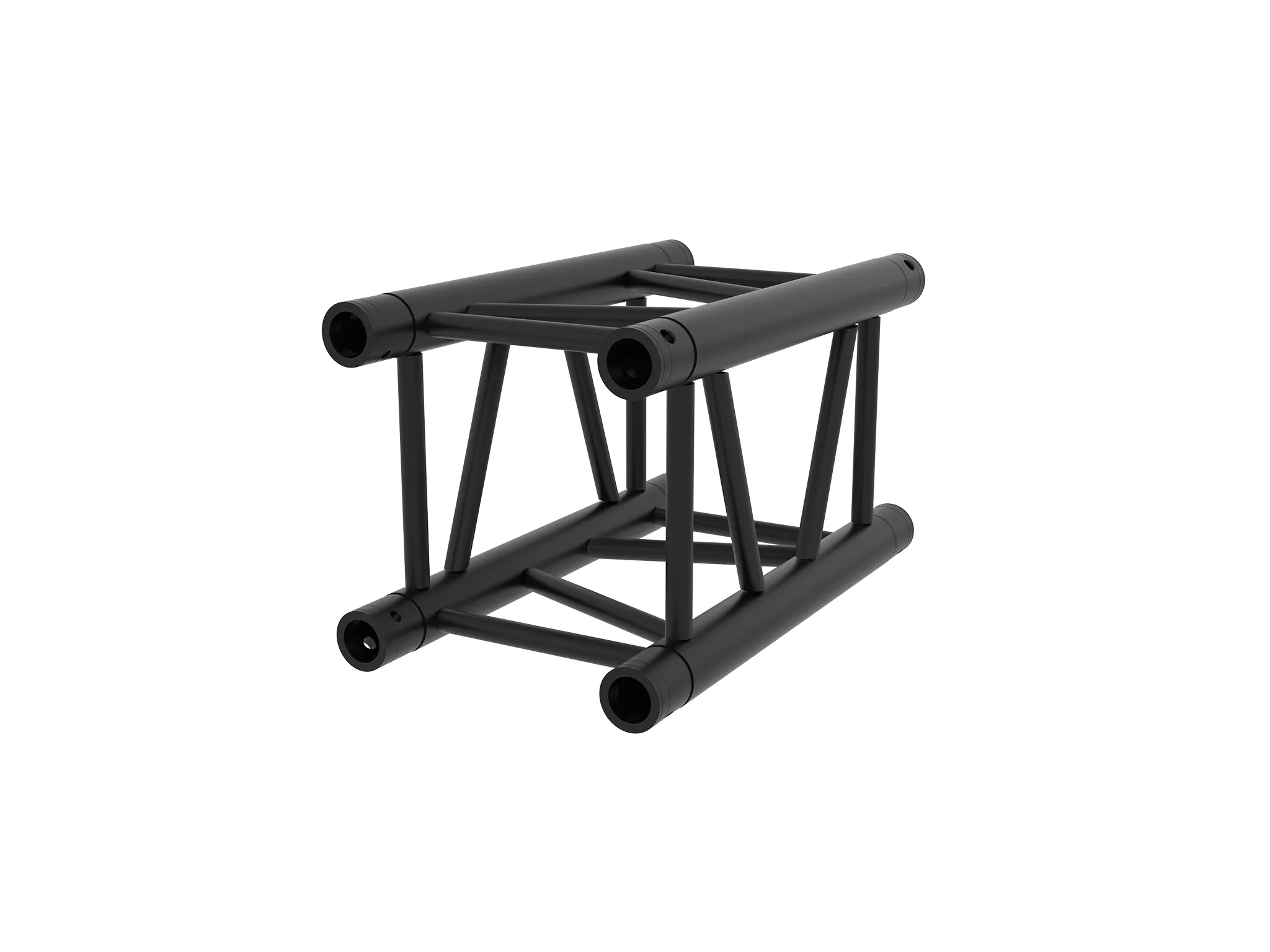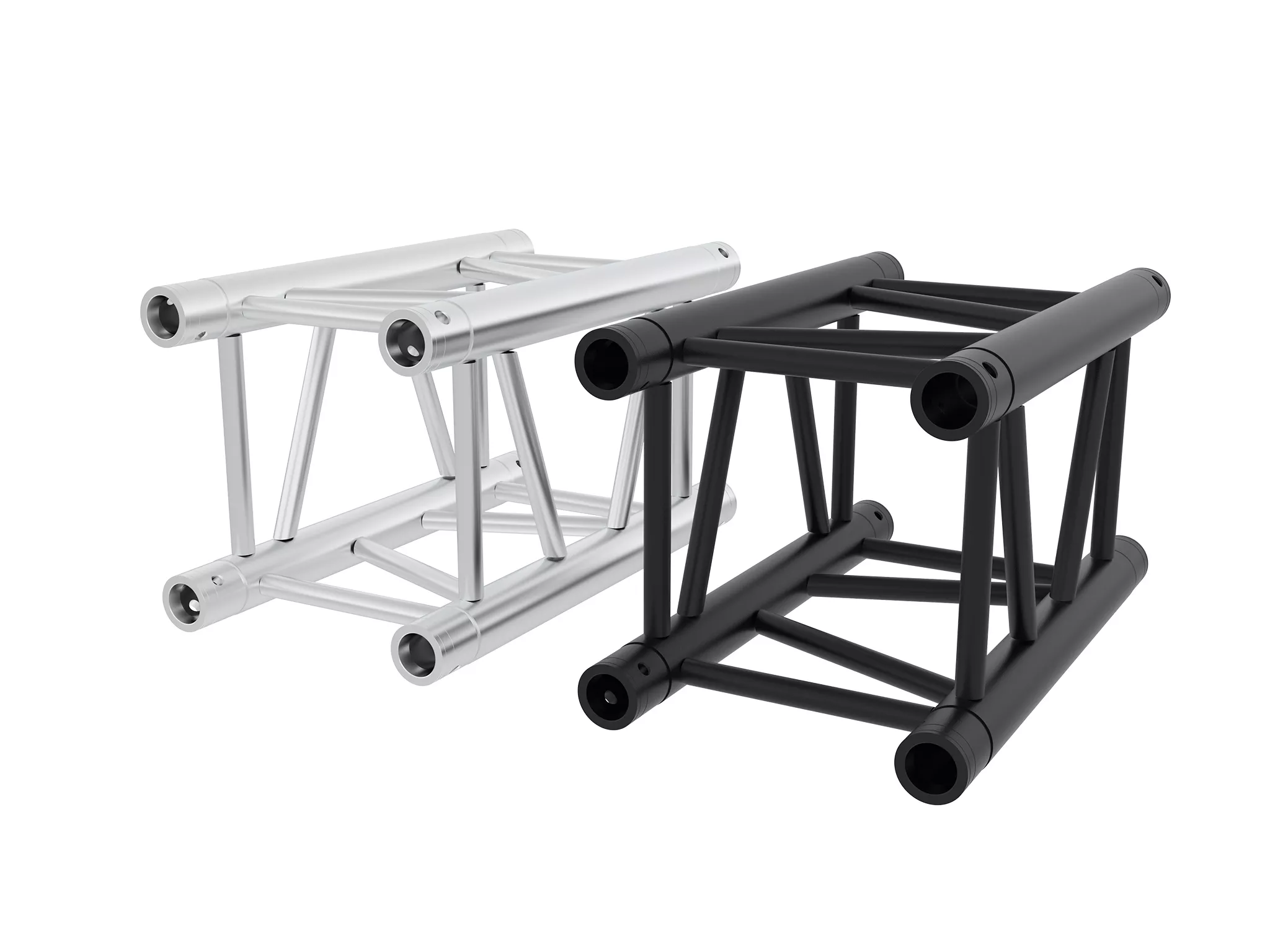 Section of aluminium square truss structure measuring 29 cm on a side, manufactured with main tube of 50 mm in diameter and 4 mm in thickness, and auxiliary tube of 20 mm in diameter and 2 mm in thickness. It is available in sections of 0.5 m, 1 m, 2 m, and 3 m, and in silver or black. Includes 4 double cones, 8 pins and 8 'R' safety clips. E PRO SERIES compatible.
